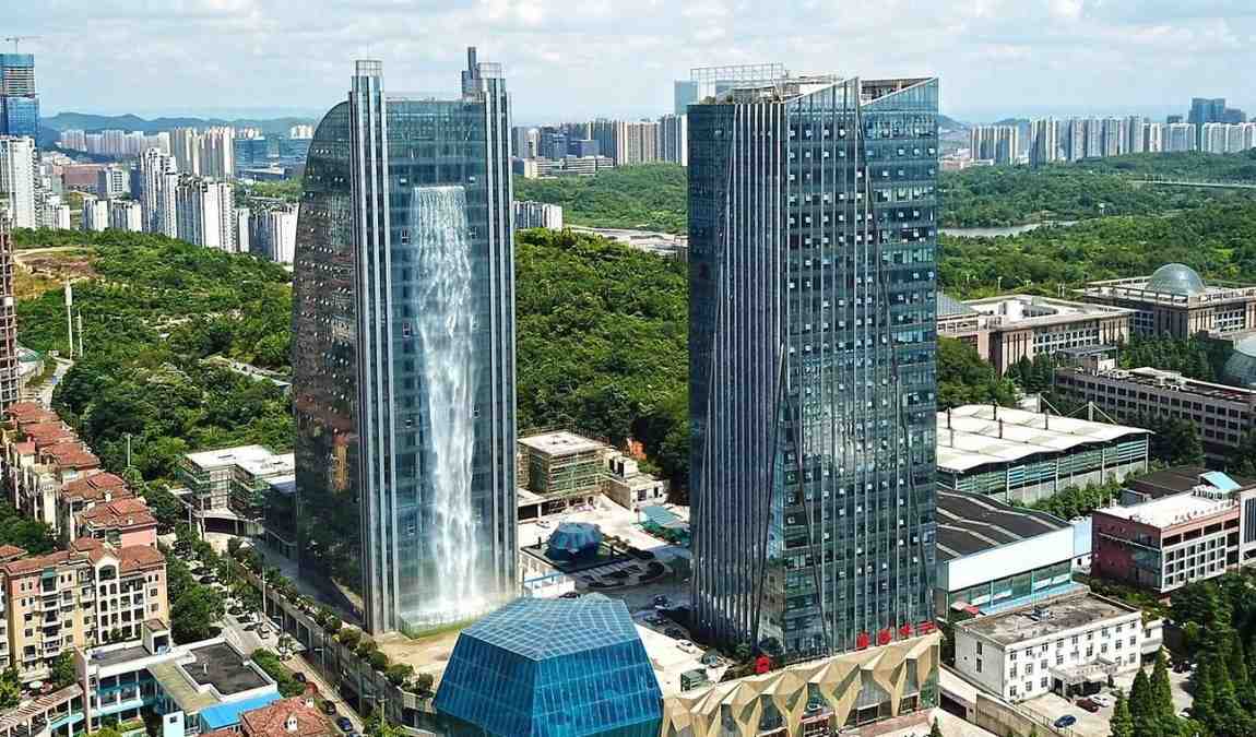 Built by Ludi Industry Group, the feature uses recycled water from basement storage tanks, which is pushed to the top of the 121-metre-high building by four giant pumps before re-emerging as a cascade from a massive opening on one side.